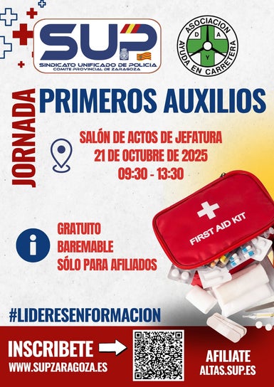El próximo día 21 de octubre de 2025 en horario de 09:30 a 13:30, impartiremos en colaboración con DYA ZARAGOZA y en las instalaciones del salón de actos de jefatura una jornada de primeros auxilios.